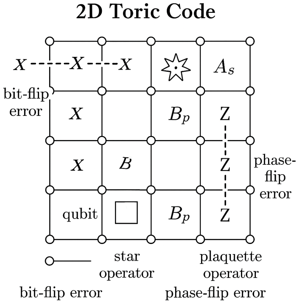 • Two types of operators (called stabilizers) act on sets of qubits: Star operators (A_s) act on the four edges meeting at a vertex.Plaquette operators (B_p) act on the four edges surrounding a face (plaquette).