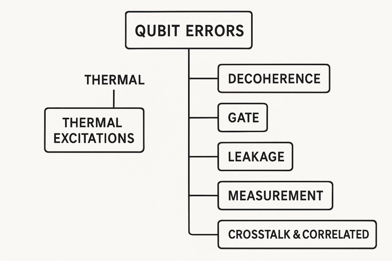 After thermal noise suppression (via liquid helium or dilution refrigeration), the dominant qubit errors are decoherence (T₁, T₂), gate control errors, leakage, measurement errors, and correlated crosstalk or radiation events. These are the main limiting factors for reaching the error thresholds required by quantum error correction codes.